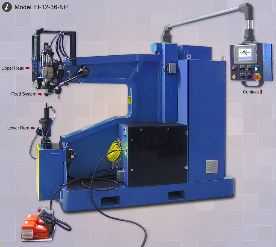 The EI - Portable Rivet Machine is an automatic drill, seal, rivet machine, utilizing an interchangeable mini-hopper rivet feed system. It is a self-contained system with associated power and control elements all mounted on a roll around cart or C-frame structure.